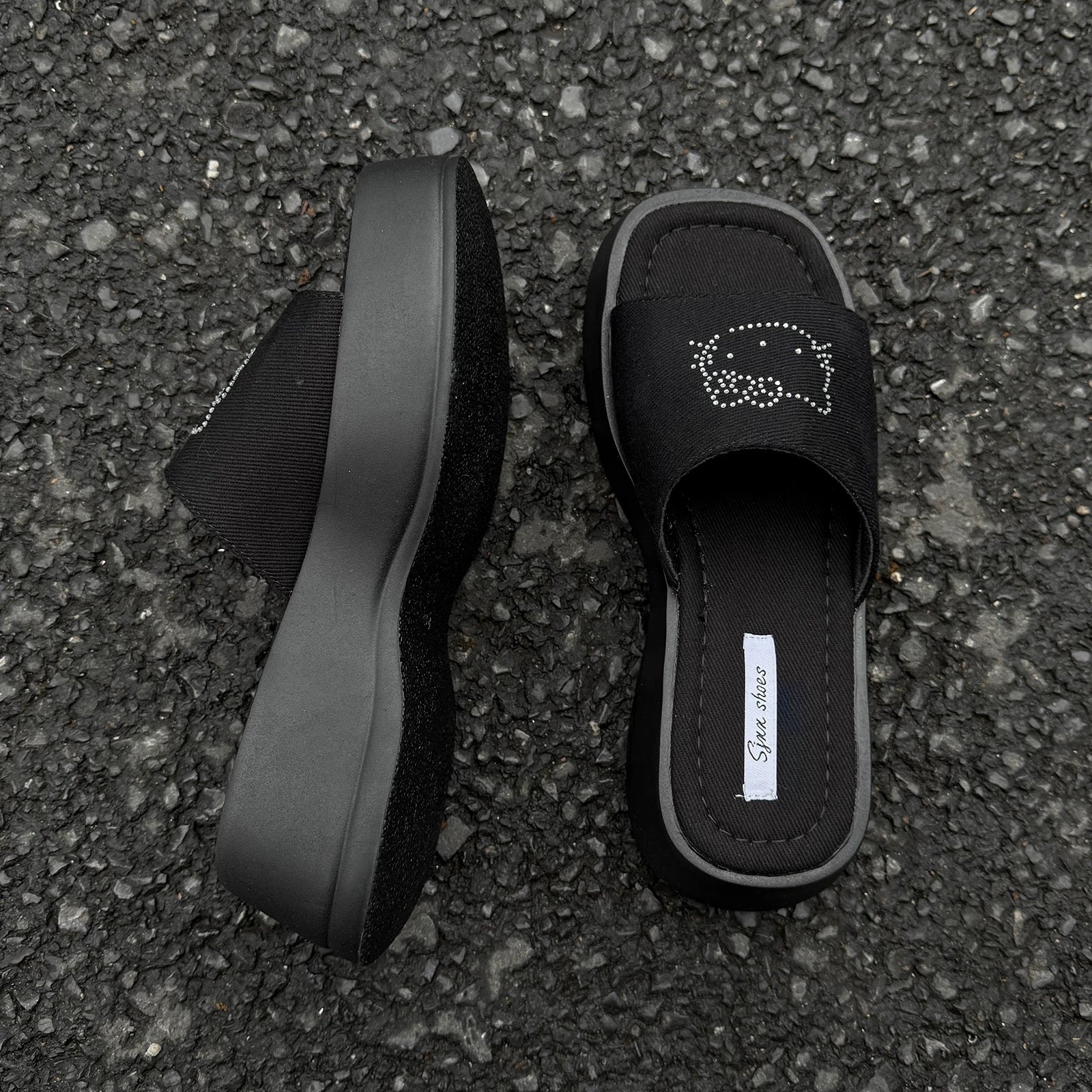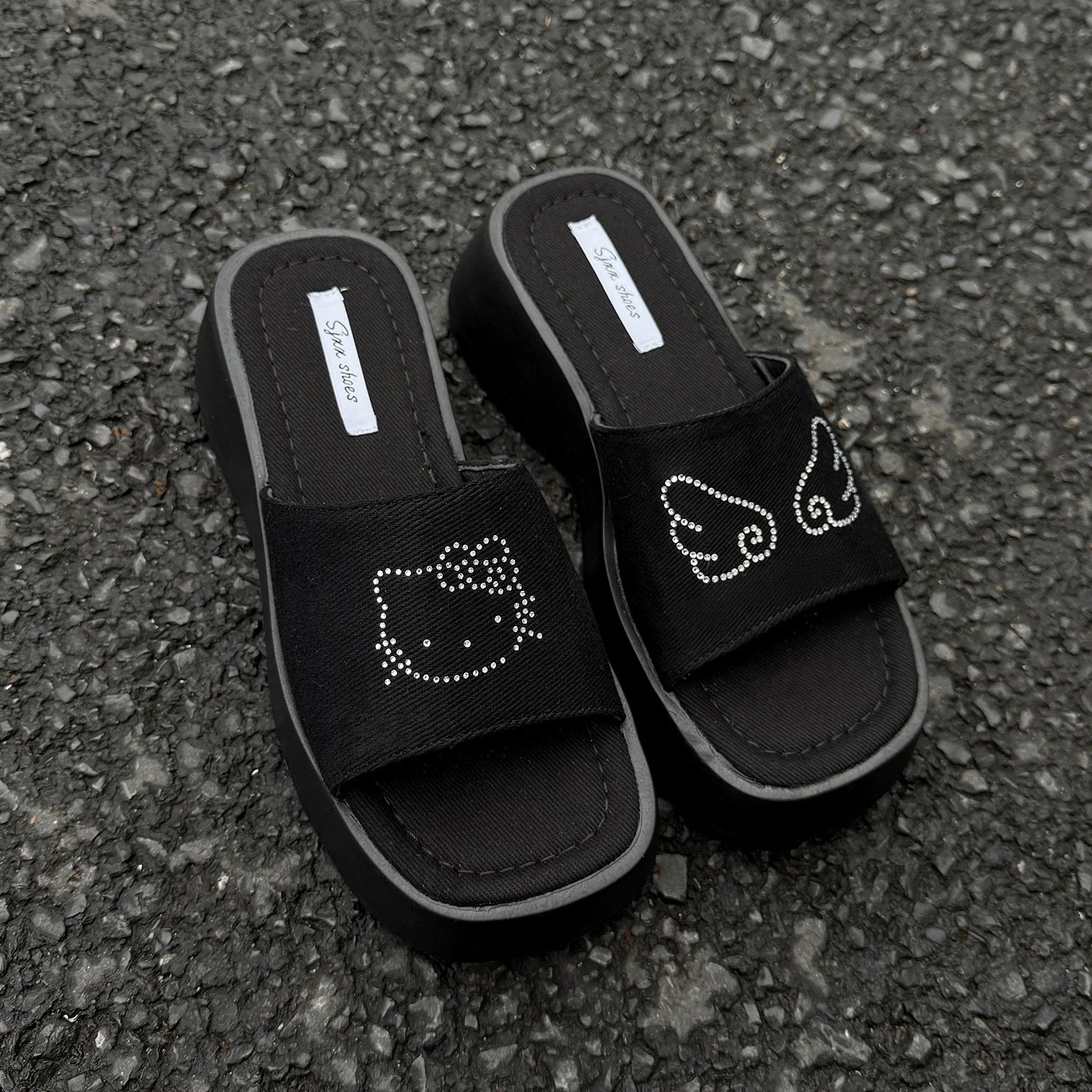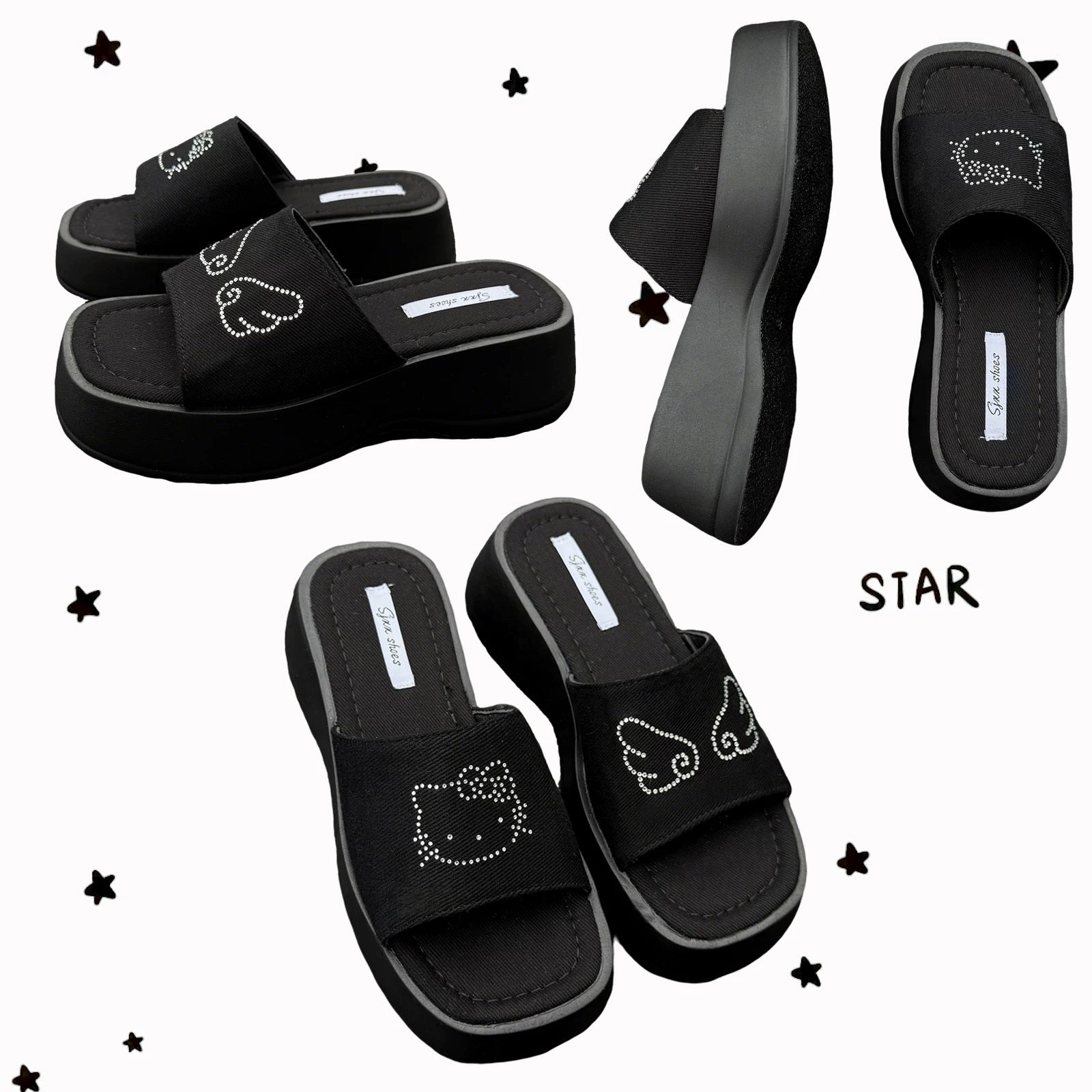 Step into the spotlight with our HelloKitty Black Heightening Sandals! Perfect for sunny beach days or city strolls, these chic sandals add 6cm of height to make you look taller and slimmer effortlessly. The hand-embellished HelloKitty design brings a touch of playful cuteness, while the sleek black color keeps it edgy and versatile. Whether you're going for a Y2K vibe, hot girl style, or just want to stand out, these sandals are your ultimate fashion staple—bold, fun, and totally wearable with any outfit!